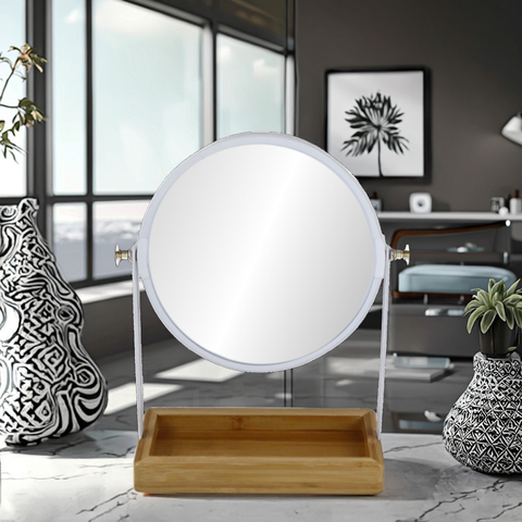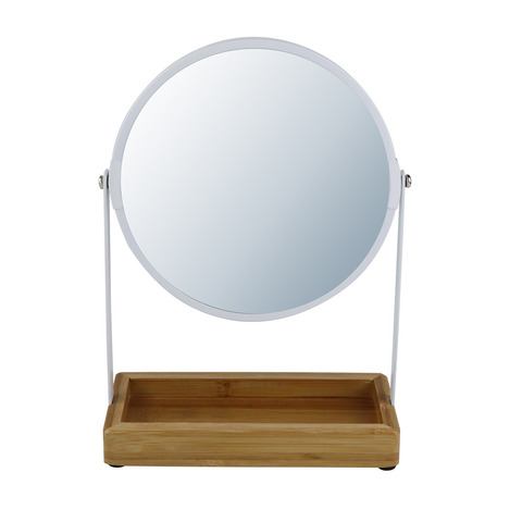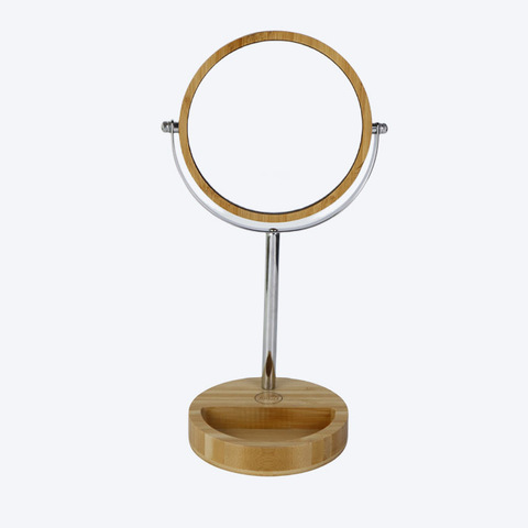 竹ベースミラー付きの360度回転した化粧品バスルームラウンドスタンドを2倍拡大
